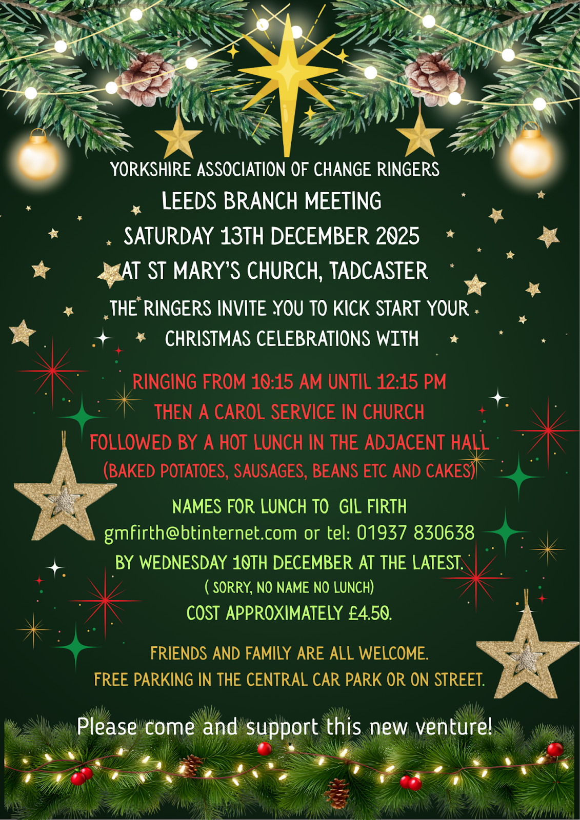 Our friends in Tadcaster have extended a welcome to ring with them, followed by a short service and a ringers lunch. This would be a fabulous way to start your Christmas festivities this year. We will need numbers before the day to ensure its success so I will continue to remind you in the coming months.